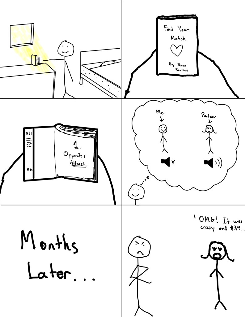 Ah, the classic rom-com trope. Unfortunately for you and your dreams of finding your opposite match, sources suggest that we look for familiarity in potential partners. However, this isn’t to say that opposites can’t attract. And, it’s not to say opposites can’t be happy together either. (Link to interesting read about this)